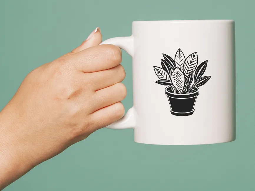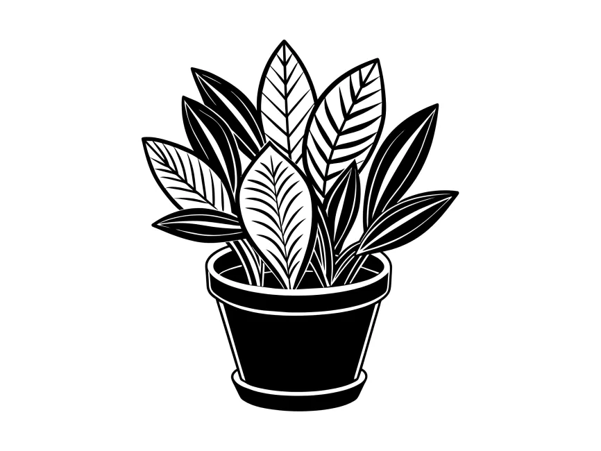 This black and white vector design features a detailed potted plant with lush, intricately drawn leaves, creating a striking monochrome aesthetic. The combination of bold black fills and crisp white outlines adds depth and visual appeal, making it perfect for modern, minimalistic, and decorative design projects.