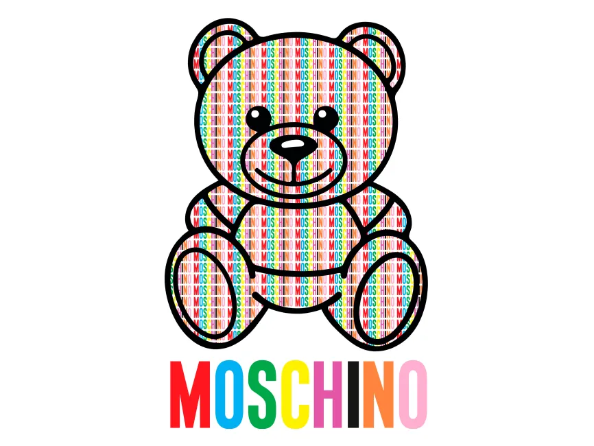The image you provided features a creative and colorful variation of the Moschino logo, prominently displayed within a stylized teddy bear illustration. This vibrant and playful visual represents the spirit of the Moschino brand: bold, ironic, and unafraid to mix high fashion with elements of pop culture and humor.