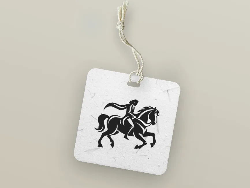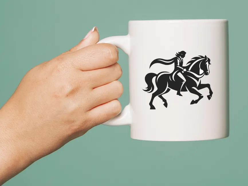 The poised, forward motion of the horse paired with the elegant rider symbolizes strength in motion and purpose-driven leadership.