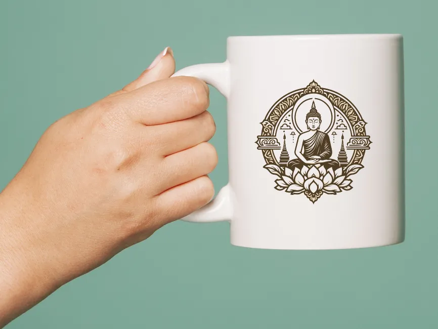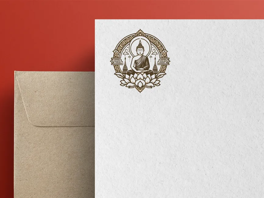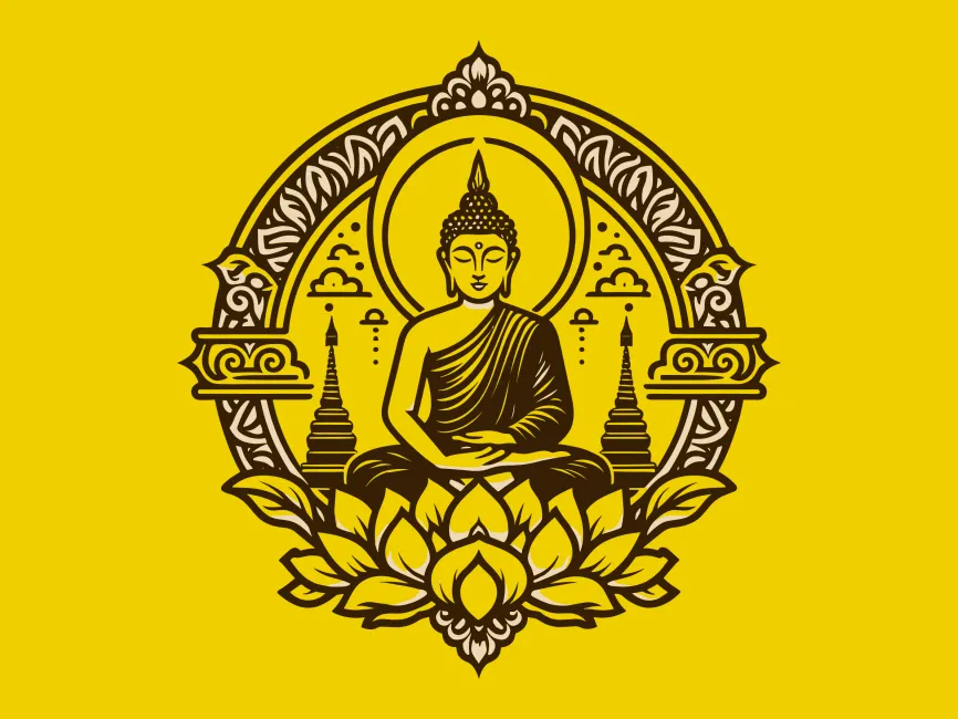 This elegant vector design showcases a seated Buddha resting upon a blooming lotus, framed by an intricately carved arch, flanked by traditional stupas and stylized clouds. Radiating calm and spiritual authority, this illustration is perfect for yoga studios, meditation centers, Buddhist cultural events, temple branding, or mindfulness-related products. It captures the essence of sacred architecture, natural symbolism, and meditative balance in one unified composition.