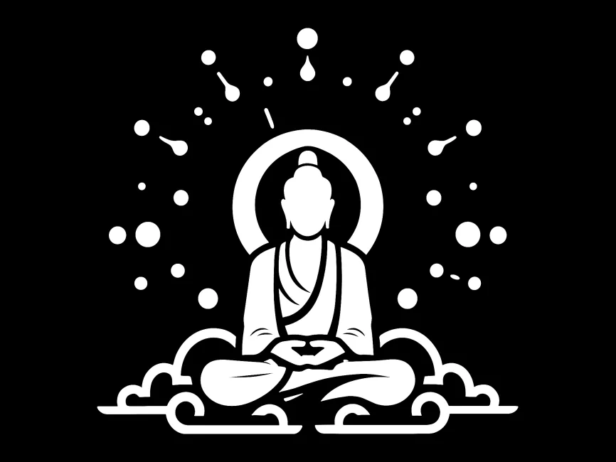 Seated Buddha Silhouette: Rendered in black with white accents, the minimalist form suggests universality, self-reflection, and serenity.