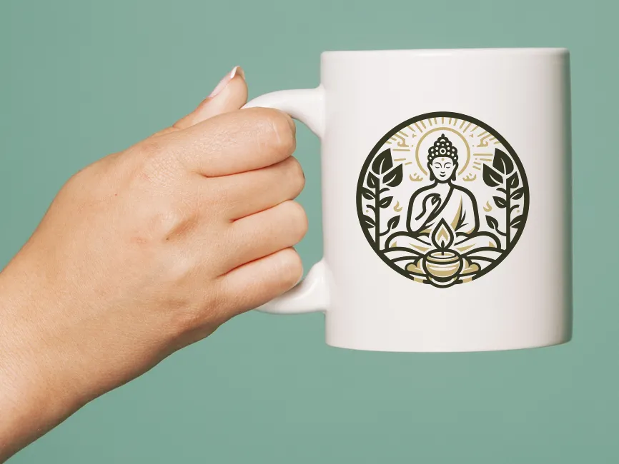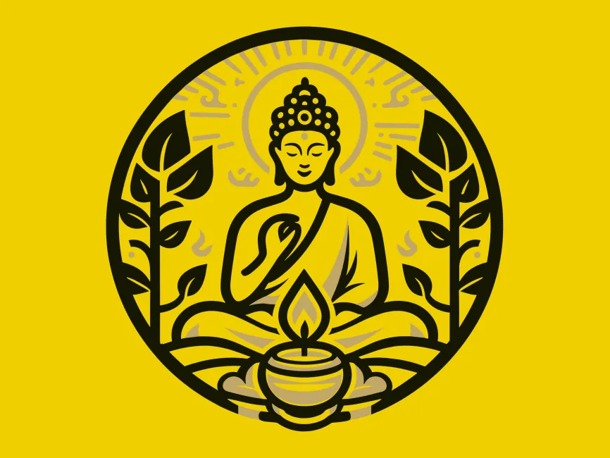 This vector design features a serene Buddha seated in meditation, framed by symmetrical leafy branches and centered around a glowing sacred flame in a ceremonial bowl. Crafted with soft contrast and symbolic elegance, this artwork is ideal for modern branding in the wellness, spiritual, yoga, and eco-conscious industries. It unites themes of enlightenment, growth, and inner calm through its clean vector style and deeply meaningful composition.