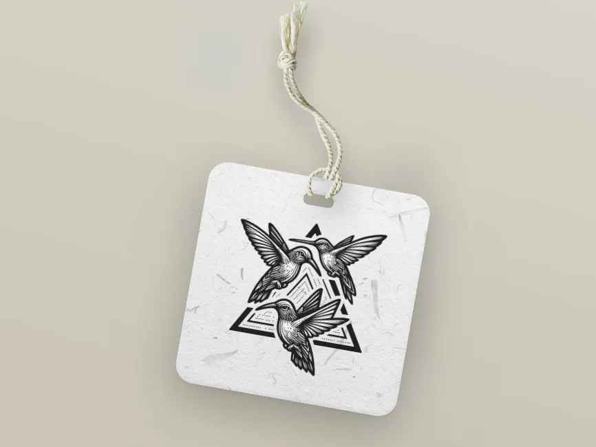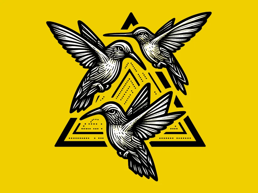 This logo template features a highly stylized and detailed trio of hummingbirds, illustrated in a traditional engraving or woodcut style, positioned over a layered, dotted geometric triangle. The triangle forms the foundational shape, symbolizing stability, balance, and connection, while the hummingbirds bring in motion, grace, and vitality.