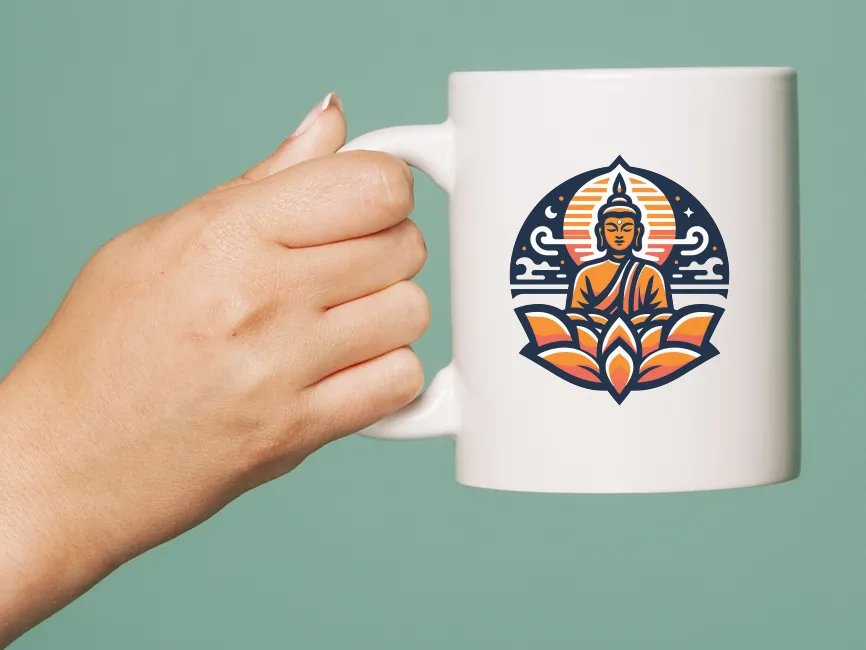 This vector design captures a stylized and vibrant representation of Buddha seated above a blooming lotus, with a radiant sunset sky as the backdrop. Unlike traditional spiritual art that leans toward ornate detail, this composition introduces a modern, minimalistic edge while preserving deep symbolic value. The use of bold outlines and gradient color fills in orange, coral, and deep navy creates a visually striking piece perfect for contemporary design needs.