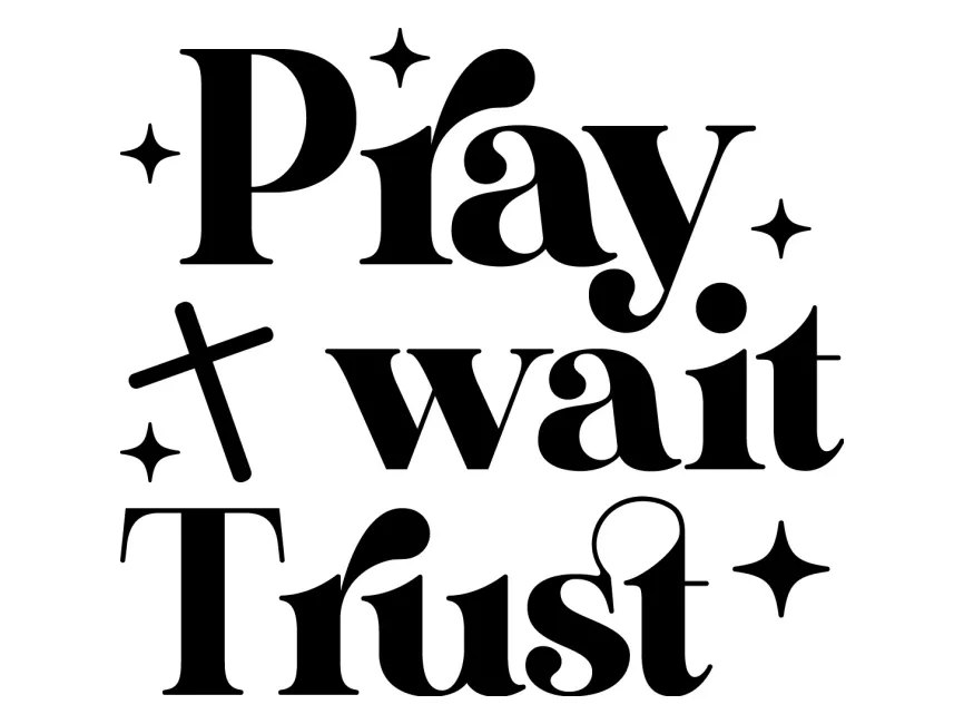 This SVG vector design features the words "Pray, Wait, Trust" in an elegant, bold serif typeface with decorative elements such as stars, curves, and a stylized cross integrated into the composition. The overall aesthetic conveys a sense of faith, patience, and spiritual devotion, making it a powerful visual representation of Christian or faith-based messaging.
