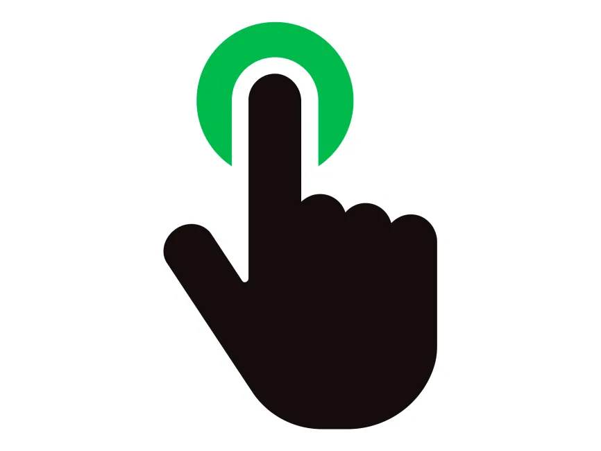 Shape and Form: The design uses a black hand icon with rounded curves, featuring an upward-pointing index finger. The fingertip aligns with a green semi-ring or touchpoint, visually reinforcing the concept of “tap to interact.”