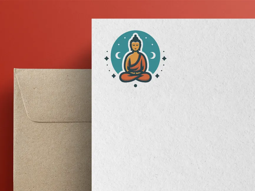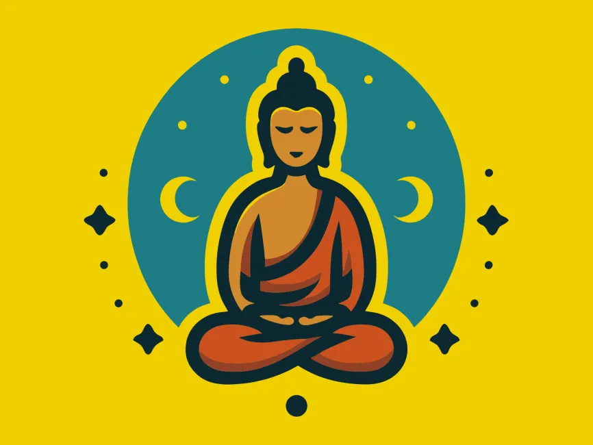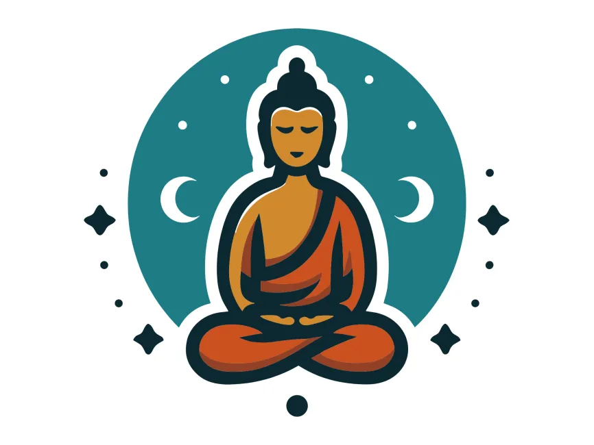 This vector design is a refined representation of a meditating Buddha figure, seated in the lotus position, surrounded by celestial elements like crescent moons and stylized stars. It radiates tranquility, introspection, and spiritual depth. The harmonious balance of circular forms and symmetrical alignment makes this artwork ideal for modern spiritual branding or wellness-related visual identities.