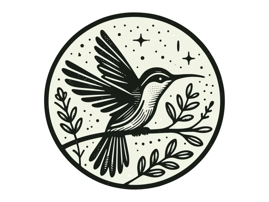 The linework and stippling effects give the design a hand-drawn, vintage aesthetic, reminiscent of old botanical illustrations or traditional tattoo art. The visual balance between the hummingbird, leaves, and cosmic elements makes the logo feel harmonious and timeless.